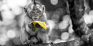 Young monkey holding banana peel in a tree (selective yellow)