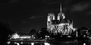 Notre dame de Paris at night, along the river Seine, long exposure, in black and white