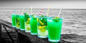 Five green drinks on a wooden fence, facing the ocean Selective colors