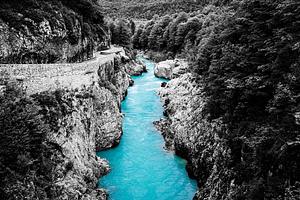 The bright "emerald" blue Soca River, running through north-west of Slovenia, in the Julian Alps, known as the "Emerald River", with a stunning bright blue all along. Black and white and selective blue.