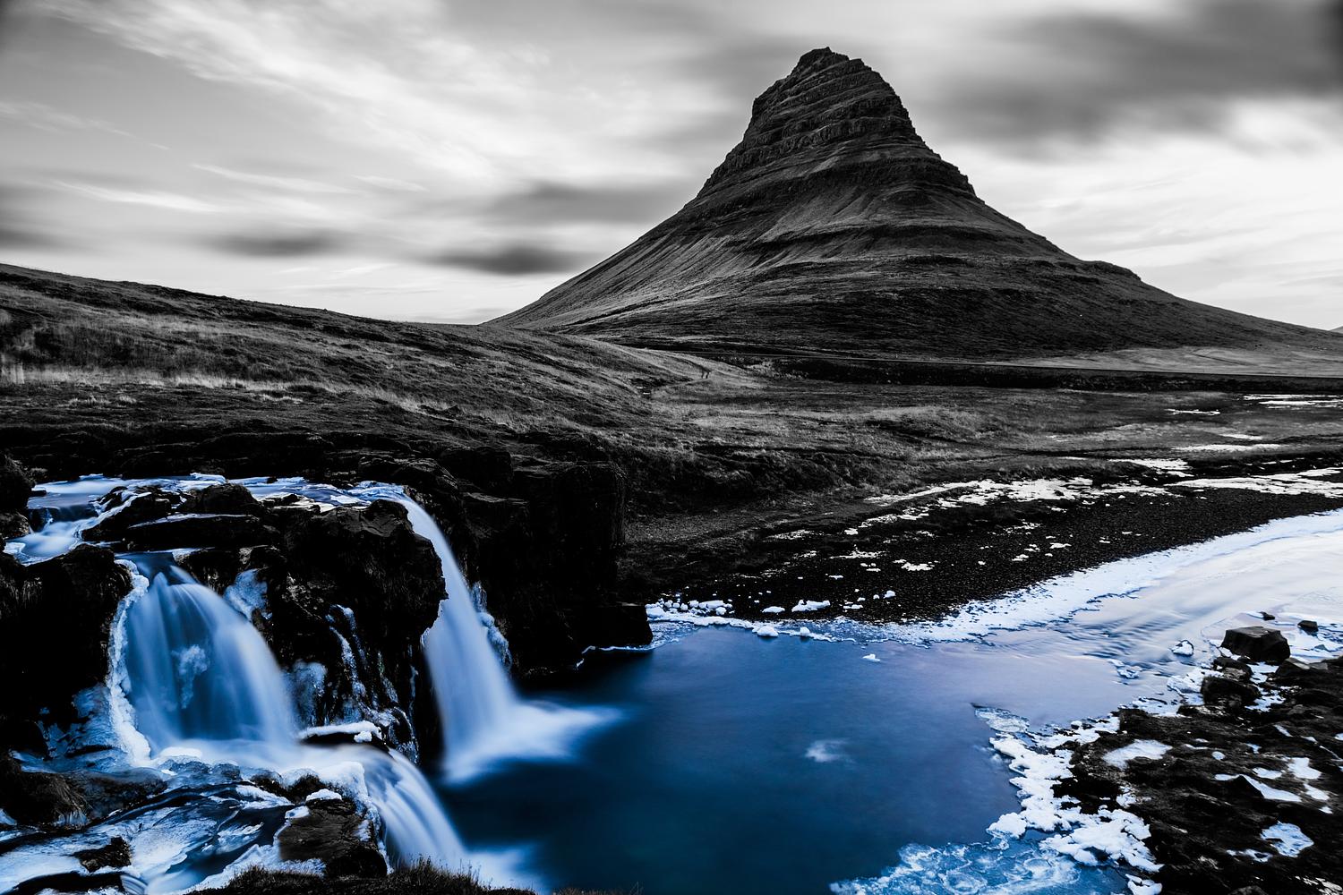 The frozen blue river, Kirkjufell mountain, Iceland Black and white and some blue