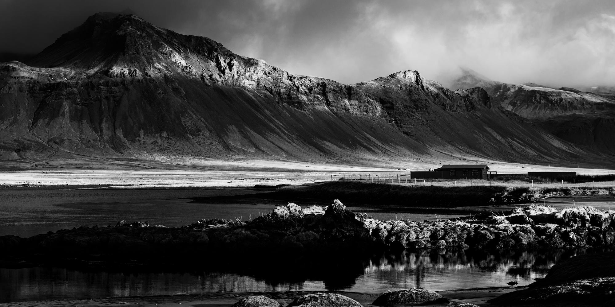 Shadows and light over a majestic icelandic mountain. Brans, pond and stones in the foreground. The late sun hitting the summit of the mountain. Cloudy sky.