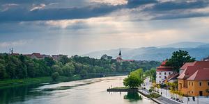 View of Maribor river shore with lightbeams from the clouds