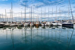 Boats aligned at the marina, reflecting in symmetry in the water, Izola, Slovenia