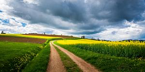 Rapeseed fields in french countryside, lots of clouds in the sky