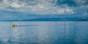 Small fishing boat on its way to the sea, cloudy sky and morning light