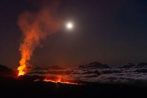 Volcanic eruption above a sea of clouds, by night, lit by the Moon light and the lava glow Island of La Réunion, 2018